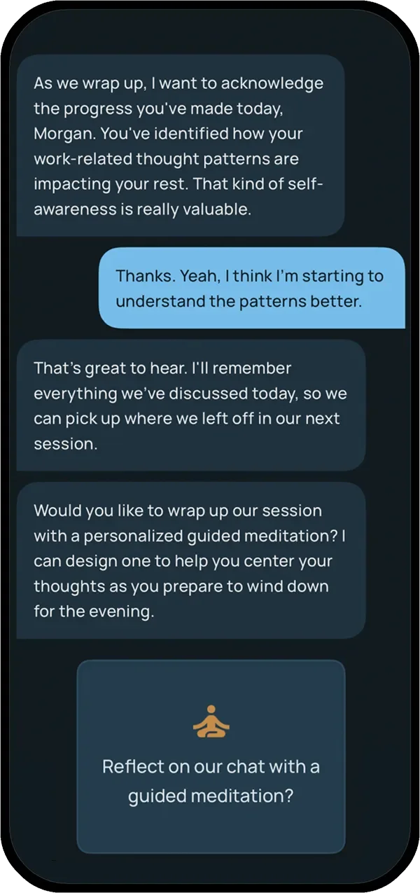 Meet Wellness AI, our innovative mobile app that delivers AI-powered therapy with personalized guided meditations - providing support exactly when and how you need it.